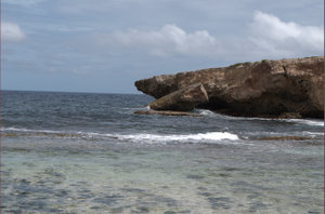 “Tidie tidie tie,” om half zeven loopt de wekker af. We willen voor de warmte een stuk over het eiland lopen. Het regent, onweert en de éne donkere lucht na de andere kondigt zich aan. Niet echt wandelweer. We ritsen een flap aan de bimini, slaan deze dubbel en vangen zo dertig liter water op. Dennis is buiten met een bezem in de weer. Ik boen binnen de vloer. Rond elf uur, het heetst van de dag, zwemmen we naar het strand. We wandelen een stuk naar het noorden. We lopen langs een rotskust. De golven hebben de rotsen helemaal ondergraven. Soms is er een gat in de rotsen waar het water bij een golf uitspuit, een gaaf gezicht. We lopen in onze zwembroek en uv-shirt. We hebben het net niet koud. De dagjesmensen die vandaag met de Mermaid en Jona Lisa naar Klein Curaçao zijn gekomen, treffen het niet. Het azuurblauwe water is door het gebrek aan zon, gewoon blauw en op het strand liggen in de regen is geen pretje.