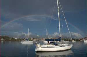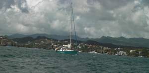 Ik heb mijn zwempak al aan en lenzen al in als het begint te onweren. We gaan toch maar even niet zwemmenn. Het onweer wordt steeds harder en komt steeds dichterbij. De boten draaien twee rondjes achter hun ankers en dat gaat gelukkig allemaal goed. Er zijn veel boten vertrokken en iedereen heeft wat meer ‘swing-ruimte’. De luiken zijn dicht. Binnen is het warm en vochtig. Zo’n dag kun je in de Carieb beter overslaan. Het regent langdurig maar niet echt hard. We vangen slechts vijftien liter douchewater op. Aan het eind van de middag moet ik nog even bewegen en roei ik naar Jacques en Annette op de Panache. Ik had hun boot nog niet van binnen gezien en bewonder de ruimte op een 50 voeter. Jacques bakt popcorn en komt een drankje later met gesneden groenten en heerlijk sausje naar buiten. Wat een verwennerij!