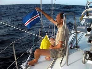 Pas op 20 mijl afstand kunnen we de contouren van het eiland naarst Sao Vicente Santa Antáo onderscheiden. Het gaat een beetje verscholen in de wolken. Wolken van mist of stof? Dennis hangt de gastenvlag van de Kaapverden in het want. Gewaarschuwd voor het venturi effect (flinke toename van wind) tussen de eilanden, rollen we de genua’s een stuk in als we het kanaal tussen de eilanden in varen. De wind neemt niet fors toe, maar de golven wel. De golven duwen ons flink de goede kant op. Voor het eerst in 850 mijl zitten Dennis en ik allebei even achter het roer. De stuurautomaat doet dit beter dan wij en we laten de grote stuurautomaat het van ons overnemen en ruimen ons geweldige stuurteam op. Het stuurautomaatje ontdoen we van al het zout en mag in de punt gaan uitrusten. De windvaan klappen we op. In het donker zoeken we waar de boten liggen. We rollen de genua’s in en ruimen de bomen op. Inmiddels heb ik een rood knipperlichtje gezien. “Daar is het volgens mij”, zeg ik tegen Dennis. “Ja antwoord hij,”pas je op voor dat onverlichte schip.” Er ligt een zeeschip onverlicht voor anker parallel aan de breakwater. We zien boten voor anker liggen. We kruipen zo ver mogelijk naar voren. Nu voel ik pas hoe moe ik ben. De boot ligt, ik poets mijn tanden en verheug me op het vooruitzicht een hele nacht en desnoods een groot deel van de ochtend te mogen slapen. We hebben het snel gedaan. 865 mijl in zes dagen en 8,5 uur betekent 136 mijl per etmaal of 5,7 knopen. En.. alles gezeild!
