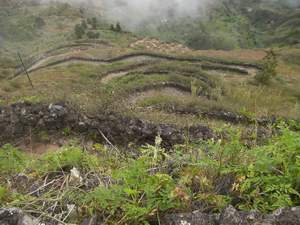 Als we ongeveer een kwart gedaald zijn, trekt de mist plotseling op. Het is alsof iemand even het gordijn openschuift. Wauw! Een prachtig groen en erg diep dal ligt onder ons. Het is echt een cadeautje dat de mist even optrekt. De wandelaars beginnen inmiddels aardig uit één te vallen. Er is een kopgroep al heel ver beneden. Hanny en en Tineke lopen steeds iets verder voor ons en Dennis en ik sukkelen met Kees achteraan. Voor Kees is het geen enkel probleem dat ik zo langzaam ga. Het zet zo ongeveer elke bloem op de foto en zorgt er zo voor dat ik me wat minder schuldig voel over mijn trage tempo.