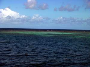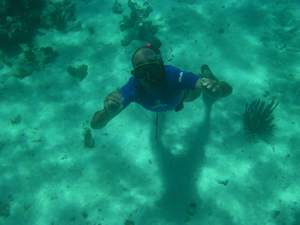 Aan het eind van de middag twijfel ik of ik nog zal gaan snorkelen of niet. Helena spoort mij aan om het toch maar te doen. Ik doe mijn lenzen in, trek mijn zwempak en zwemvliezen aan en zet mijn duikbril op. “Houd me in de gaten,” zeg ik tegen Dennis en Helena. "Als de stroom te sterk is, zwem ik wel naar diep water en mogen jullie me oppikken." Ik wil naar de punt van het eiland zwemmen, het ziet er daar ondiep uit. In het boekje staan bij deze duiklocatie tekens van gemiddelde tot sterke stroming. Het eerste stuk is alsof ik over een duingebied zwem. Veel zand en af en toe een ‘struik’. Hier een daar wat grote vissen. Bij de punt is het koraal prachtig. Wat ik al dacht. Plotseling zwemt er op tien meter afstand een rog van twee meter doorsnee voorbij. Deze is anders dan de roggen die ik eerder gezien heb. Hij is zwart met witte stippen, zwemt heel gracieus en heeft een enorm lange staart. Het lijkt wel een roofvogel zoals hij zwemt. Erg indrukwekkend. Wild enthousiast klim ik weer uit het water. Er stond niet veel stroom. Helena laat mij een plaatje van de rog in haar vissenboek zien. “Ja, dat was hem,” antwoord ik. ‘Adelaarsrog’ staat er bij. Een toepasselijke naam. Het is goed om te weten dat deze vis geen mensen aanvalt en dat de staart niet giftig is, in tegenstelling tot een klein puntje van zijn achterlijf.