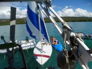 “Ik durf het bijna niet te vragen ….” Er woont hier een Duitser die we vorig jaar ontmoet hebben. Jaarlijks rond deze tijd komt hier een groep vrienden bij hem logeren om te surfen. Daar staat nu te weinig wind voor en één van de gasten komt met een sunfish, open zeilbootje, een praatje maken bij Sally Lightfoot. Dennis is daar aan boord om naar de marifoon en de accu’s te kijken. Ik ben al terug op Bodyguard om een lunch met pizzabroodjes te maken. Maar dat kan wachten. Ik kayak weer naar Sally Lightfoot. Natuurlijk mag ik even in het sunfish-je varen. Een sunfish is een grote platte open zeilboot, soort grote surfplank, met een groot gaffelzeil. Ik denk dat het vergelijkbaar zeilt als een laser. Het bootje komt gemakkelijk op snelheid en stuurt heel licht. Het is echt genieten om met dit bootje te zeilen, zelfs met heel licht weer.
