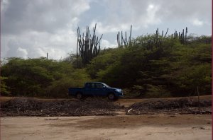 Met de auto rijden we naar Wayaka II, een duik- en snorkelplek. De wegen in het park zijn onverhard en langs de kant staan metershoge cactussen.